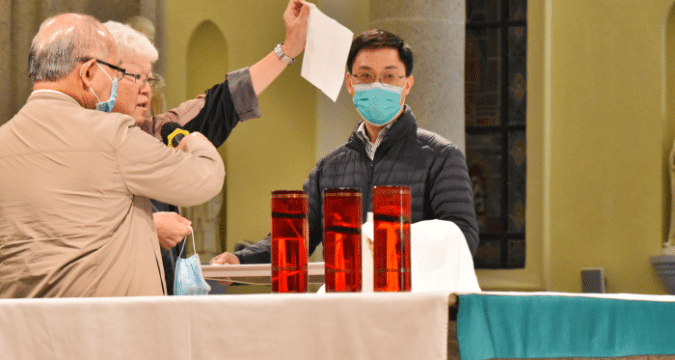 Father Thomas Law Kwok-fai demonstrated in detail how to receive Communion with clean hands. Communicants are first required to sanitise their hands with alcohol gel provided by liturgy representatives and receive the host with one hand. After leaving the queue, they can remove one loop of their mask with another hand. They are then advised to place the host into their mouth with the clean hand which has had no contact with their mask, put their mask back on and clean their hands with alcohol afterwards.
