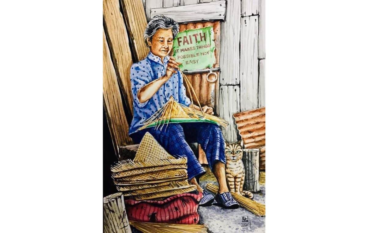 This watercolour painting depicts a old lady sewing straw hats with joy, earning her every penny with hard work, under a poster saying, “Faith—It makes things possible, not easy.”