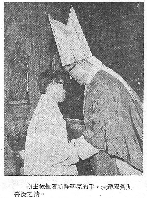 A photo from the front page of the Chinese language diocesan weekly taken during the ordination of Father Lee at the Cathedral of the Immaculate Conception on 28 November 1975. Father Lee was the first local diocesan priest ordained by John Baptist Cardinal Wu. File Photo: Kung Kao Po